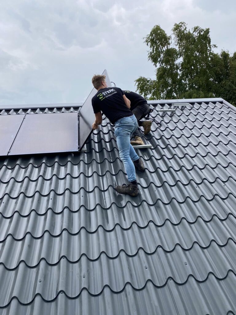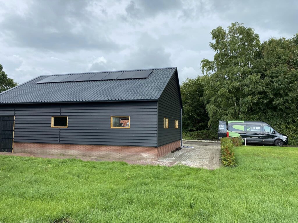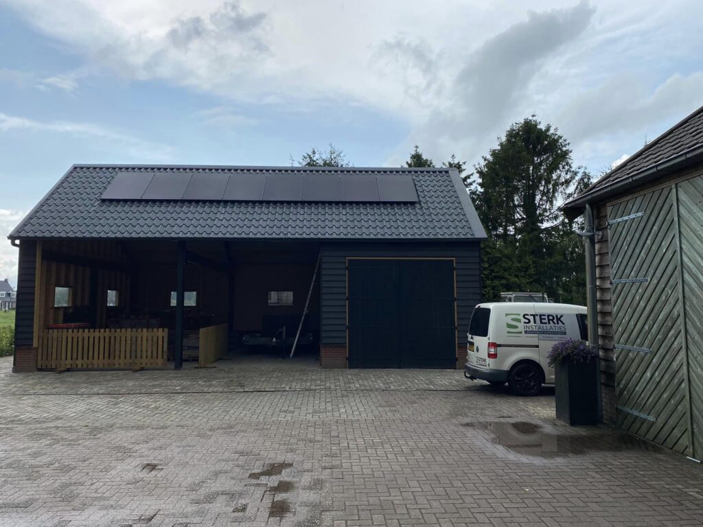 16 full black zonnepanelen met micro-omvormers van Enphase geplaatst op de schuur van Hoveniersbedrijf Gerrit Vos.
